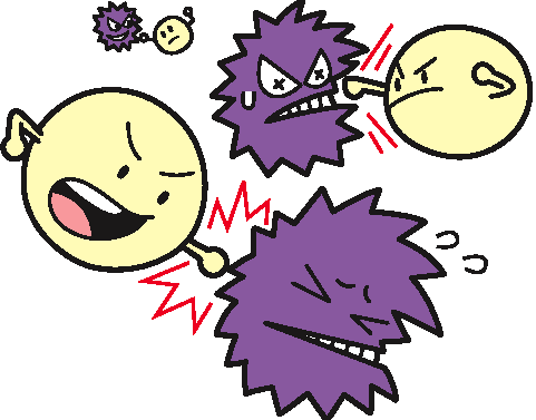微生物にはたくさんの種類がありますが、大部分は無害で、ごく一部が病原性を示します。それら病原性微生物も、私たちが健康で体力が普通にあれば、病原性を発揮できません。体力が落ちたときや、けがをして皮膚の防衛機能がこわされたときなどに、病原性微生物の侵略を受けると病気になるのです。